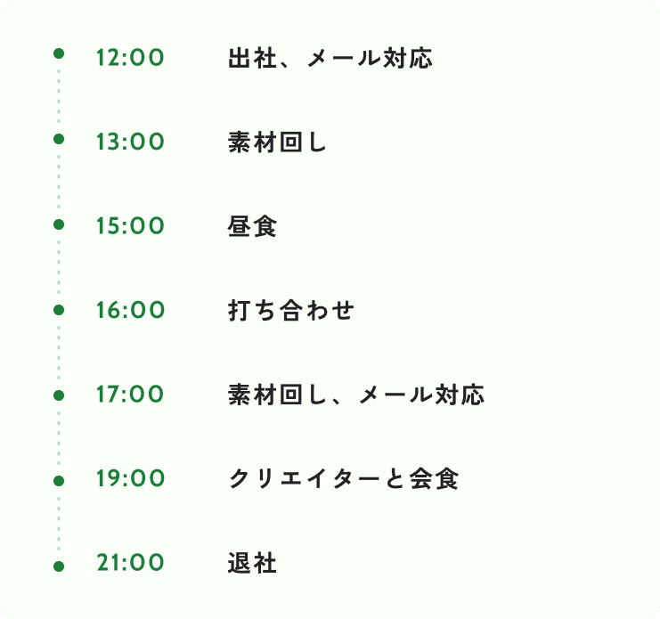 最初は、先輩について制作補佐として打ち合わせの準備や、素材整理を担当します。慣れてきたら、素材を次の工程に回したり、クリエイターへお仕事の依頼を始めていきます。