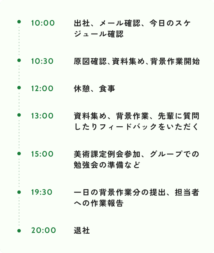 その後、本番作業を少しずつ始めていきます。更に3か月程、先輩のフィードバックをいただきながら経験を積んでいきます。入社して6か月後くらいから作品班に配属されて本格的に本番作業に入っていく流れです。